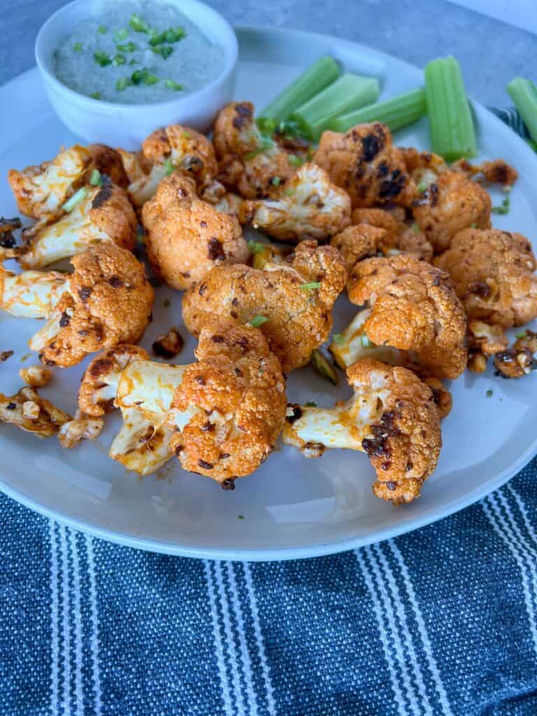 Whether you are cooking for a game day meal or just a weeknight meal, you can’t go wrong with Buffalo Cauliflower. This is a combo that I was reluctant to try for so long, but started ordering it as an appetizer at every restaurant I could find it and fell in LOVE. There is something about eating something that is messy, but also knowing it is just a veggie, or maybe that is just me!