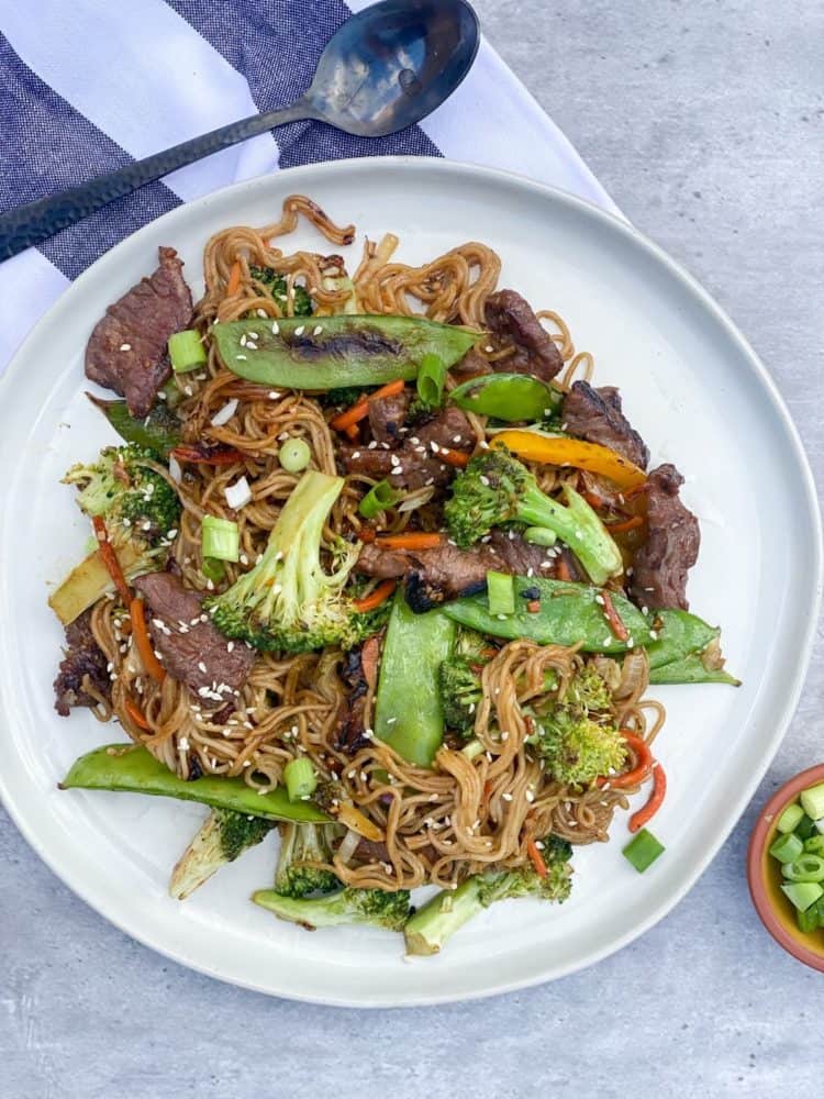 - For this lo mein, I recommend flank steak because it does grill up quickly and is easy to slice thin. If you have another cut on hand, you can use that, just know that you will have to adjust cook time accordingly.