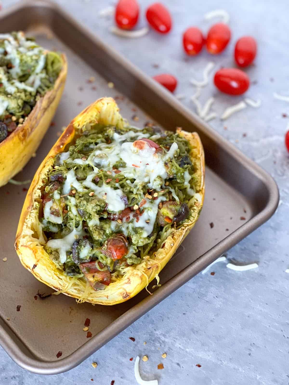 - When the spaghetti squash is fork tender, remove from the oven. Scrape out the inside of the squash to male "spaghetti". Add this to the pan of the veggie mixture and add the pesto. Mix everything until is is combined and evenly coated with pesto.